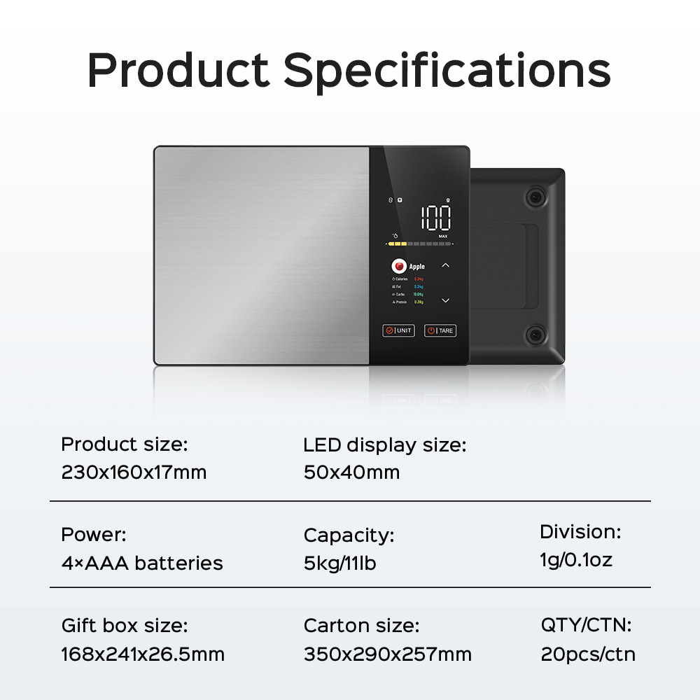 Functionality: Bluetooth connectivity, unit conversion, nutritional calculation, auto shutdown, low battery
